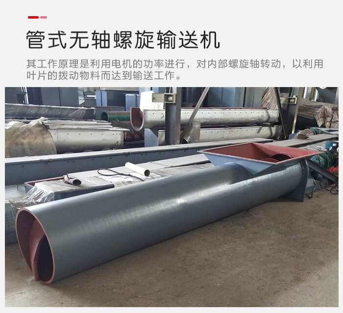 管式無軸螺旋輸送機其,工作原理與管式有軸螺旋輸送機的工作原理大致相同,其都是利用電機的功率進行工作的實現(xiàn),然而它們之間的不同就是其,有/無螺旋軸的區(qū)別