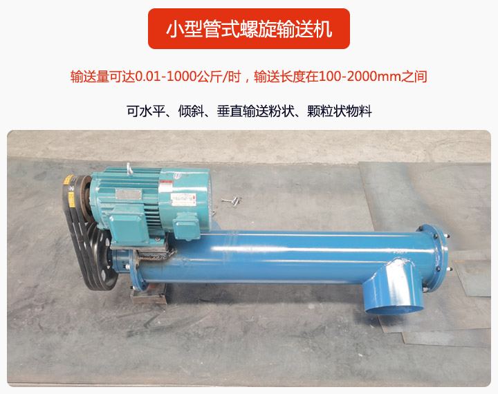 小型管式螺旋輸送機適用于建材、化工、電力、冶金、煤炭、糧食等行業(yè),適用于水平或傾斜輸送粉狀、粒狀和小塊狀物料,如煤、灰、渣、水泥、糧食等。